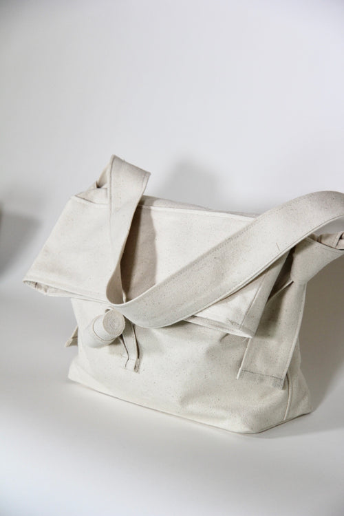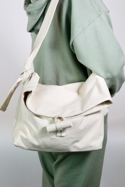 This clutch is crafted from 100% sustainable eco-cotton, in an Off-white upcycled denim material.