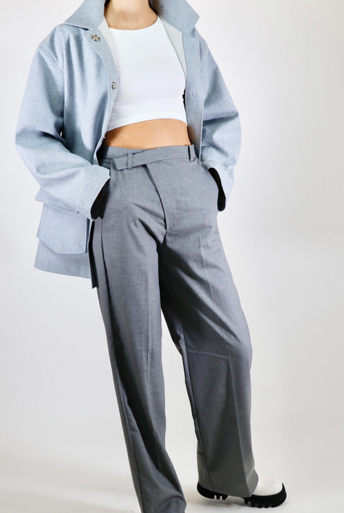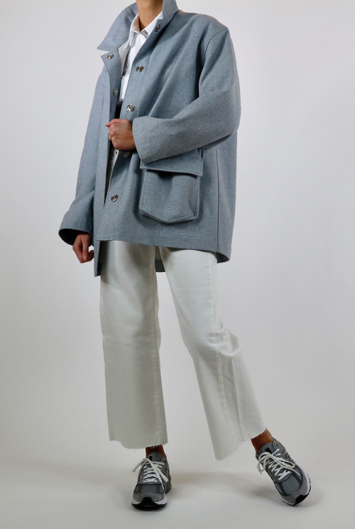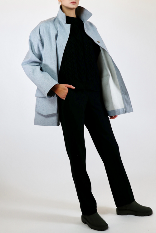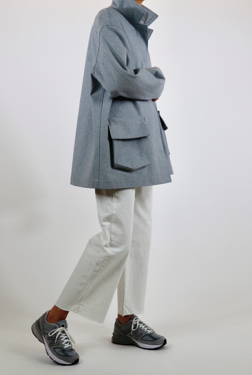 The Murray barn coat is cut for an oversized fit. Luxurious, thick upcycled denim in a one of a kind light blue material. Made with 100% sustainable eco-cotton.