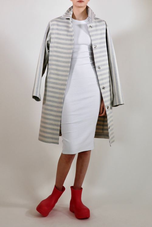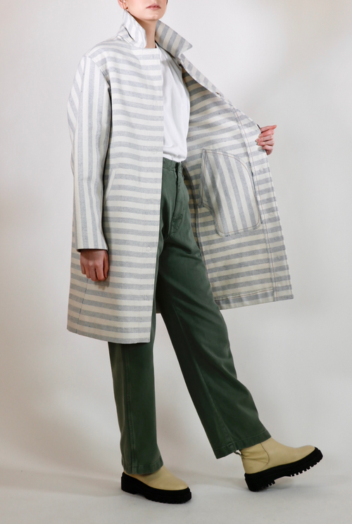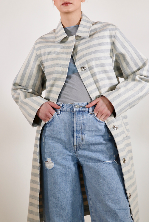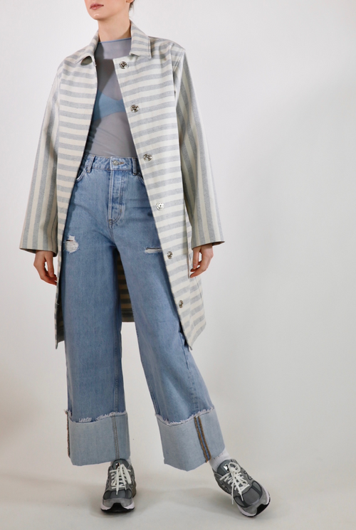 The Victoria overcoat is a statement piece with a sleek cut. Luxurious, upcycled denim in a one of a kind blue and off-white stripe material. Made with 100% sustainable eco-cotton.