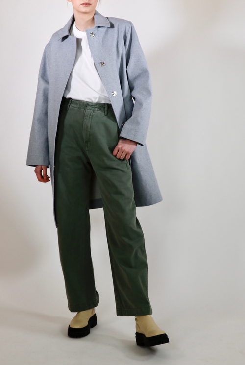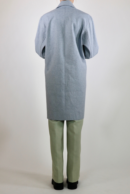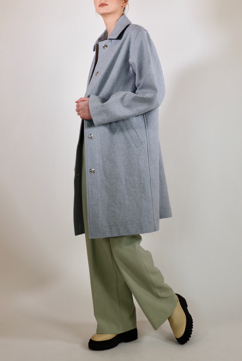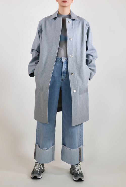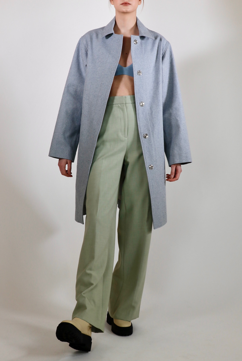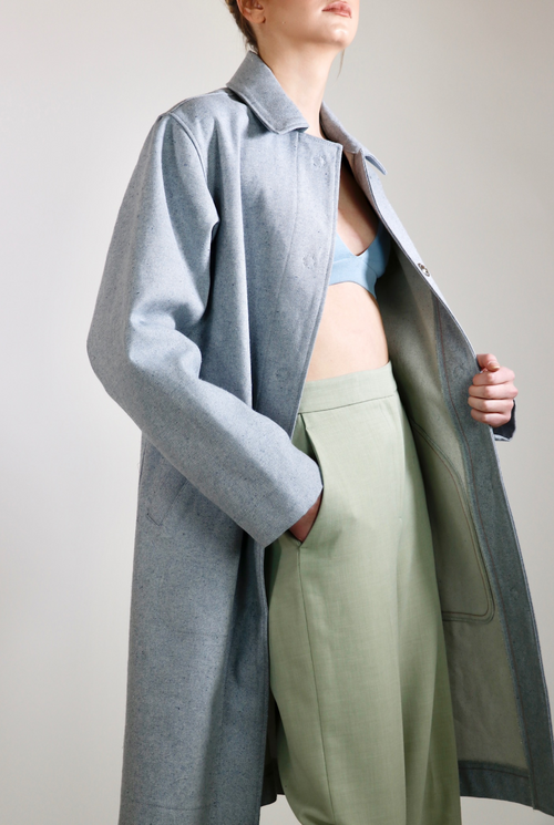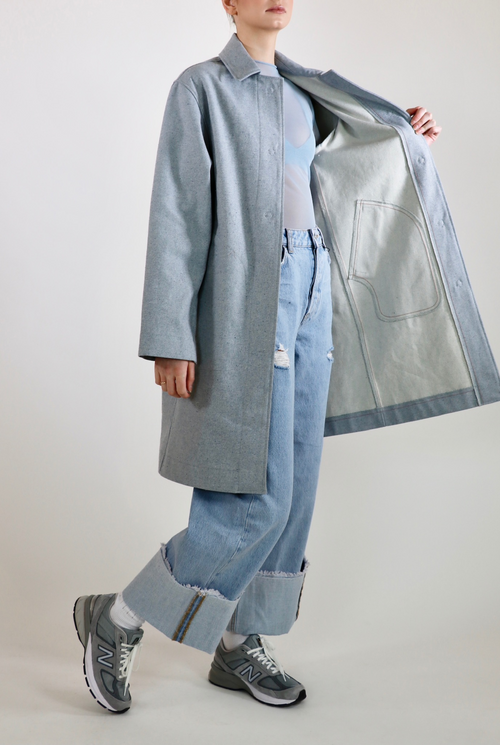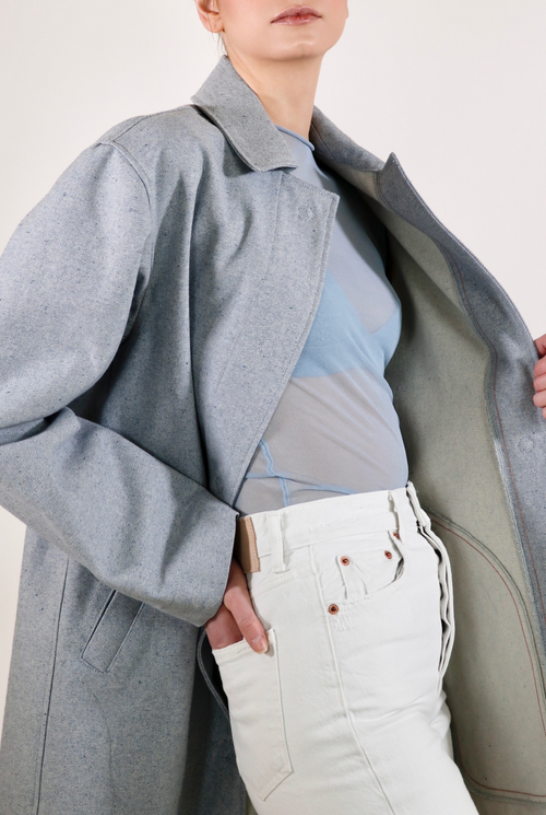 The Victoria overcoat is a statement piece with a sleek cut. Luxurious, thick upcycled denim in a one of a kind light blue material. Made with 100% sustainable eco-cotton.