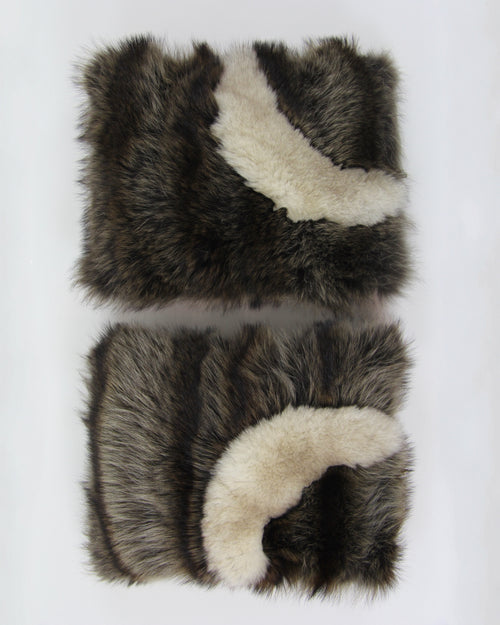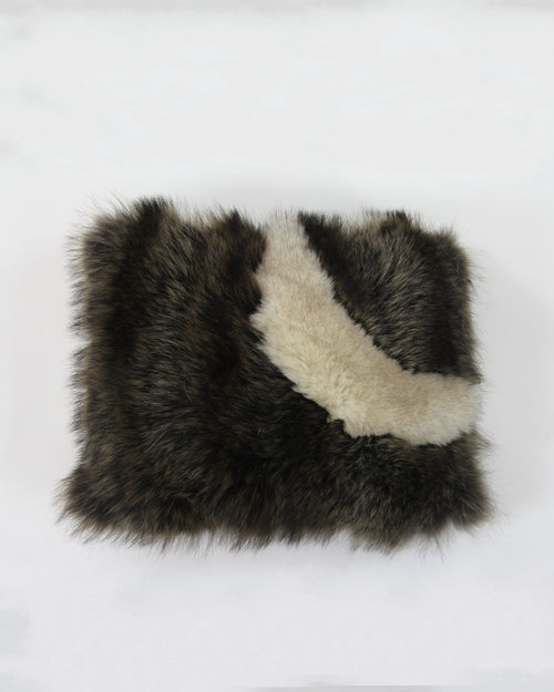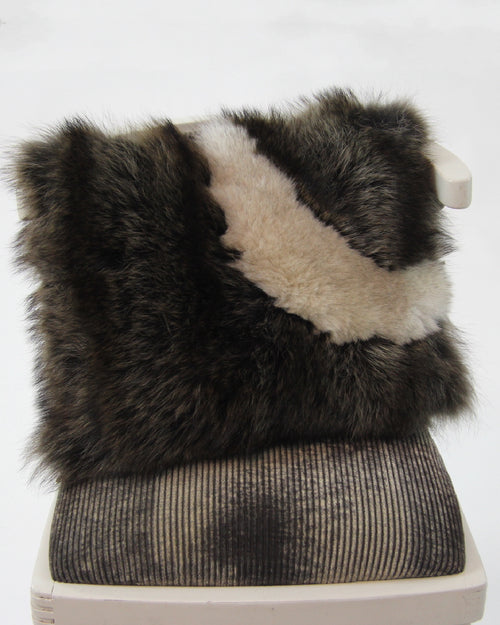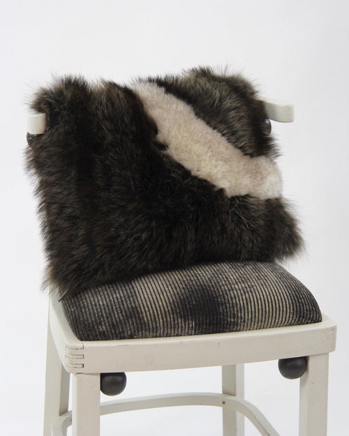 One of a kind cushion from recycled racoon fur with recycled indigo fox and coyote fur trim. Soft and luxurious accent for a bed or a sofa with matching recycled fur blanket.
