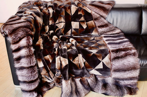 One of a kind blanket from recycled sheared beaver fur with recycled racoon fur trim. Soft and plush, perfect for adding layers of warmth over a bed or a sofa.