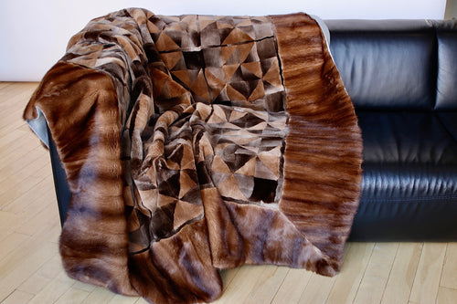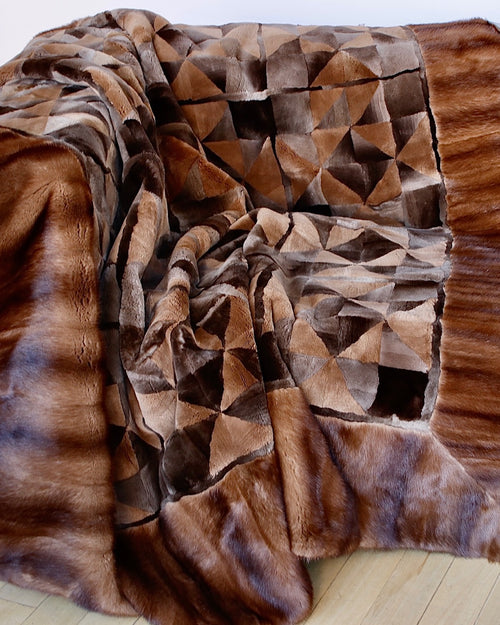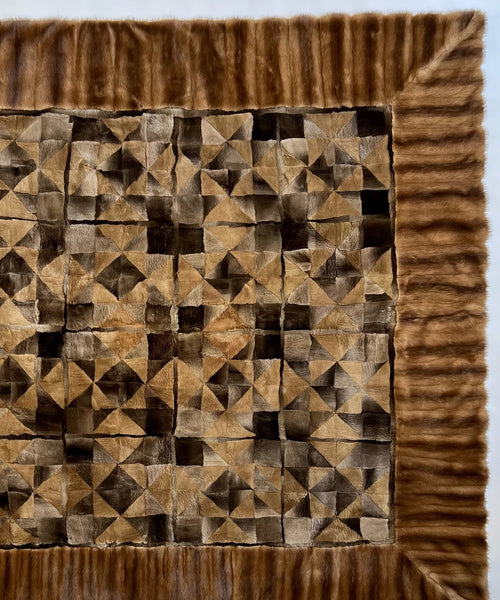 One of a kind American quilt-style blanket from recycled sheared beaver fur with demi-buff mink fur frame.