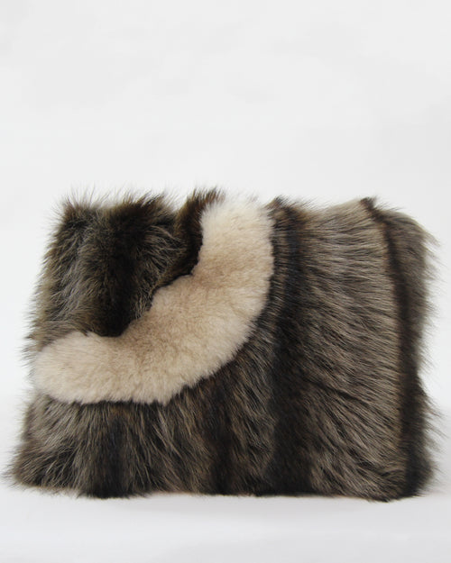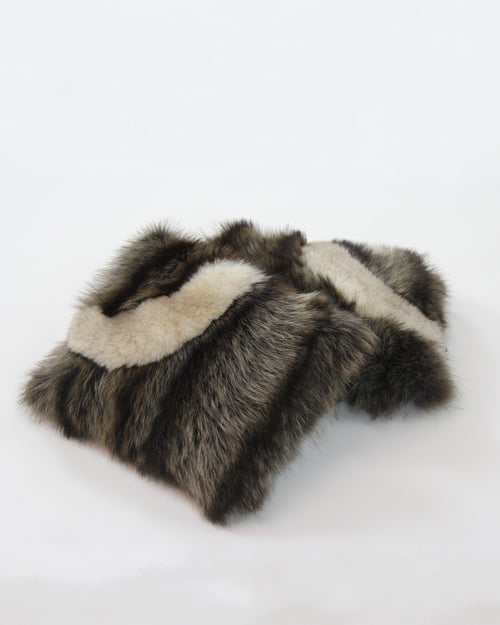 One of a kind cushion from recycled racoon fur with recycled indigo fox and coyote fur trim. Soft and luxurious accent for a bed or a sofa with matching recycled fur blanket.