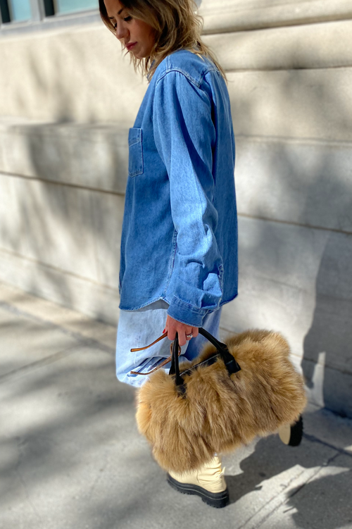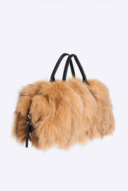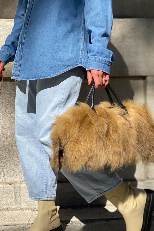 The perfect sized Stanton bag is made from upcycled fox, leather trim with a hand polished zipper and inside patch pocket and is carried by hand with its top handles.