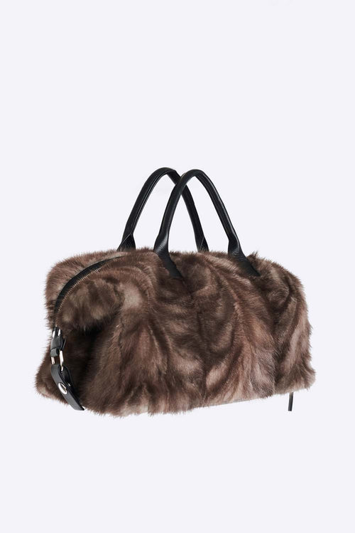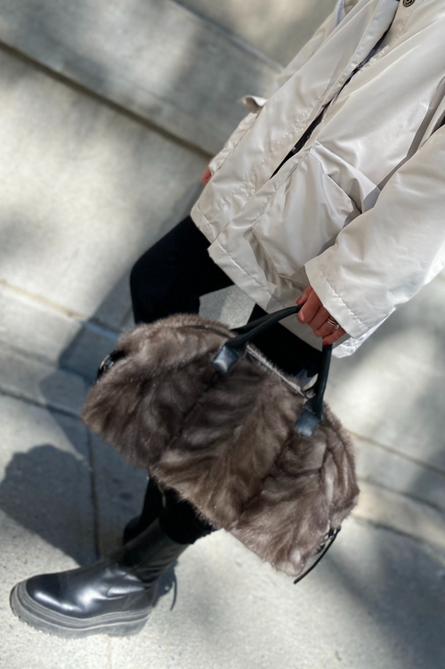 The perfect sized Stanton bag is made from upcycled mink, leather trim with a hand polished zipper and inside patch pocket and is carried by hand with its top handles.