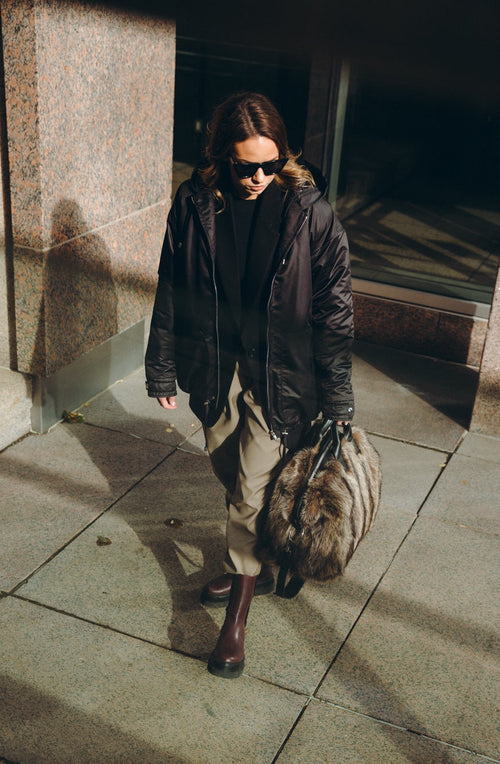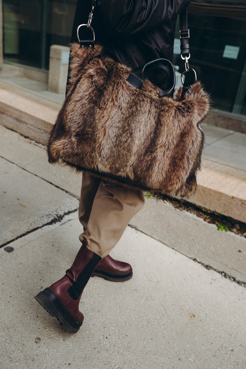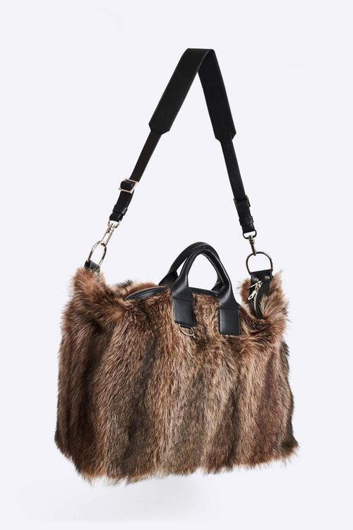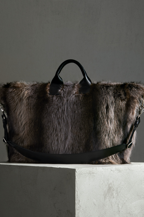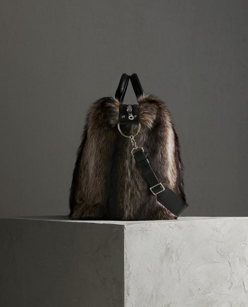 This medium duffle is made in soft upcycled long hair racoon with leather trim, polyester lining and comes with a removable leather shoulder strap.