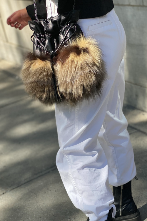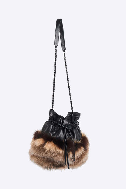 The Thornhill handbag is made from upcycled fox pieces and black leather with a leather braided metal chain. Perfect for a day-to-evening use. Its ingeniously designed base expands to store extra necessities.