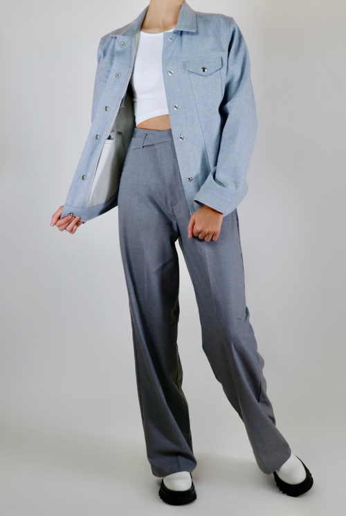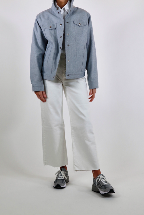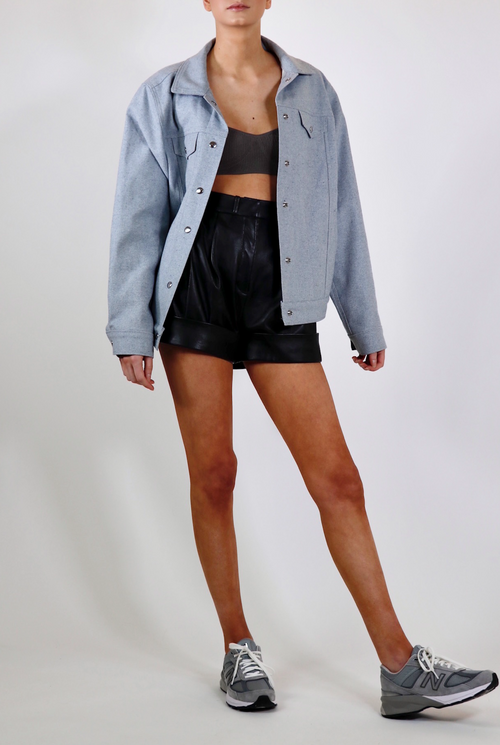 Oakland jean jacket is cut for an oversized fit creating a unique look and style. Luxurious, thick upcycled denim in a one of a kind light blue material. Made with 100% sustainable eco-cotton.