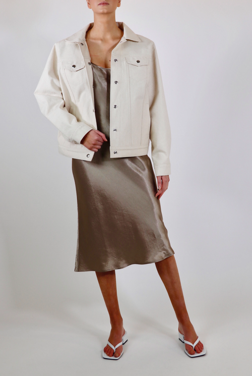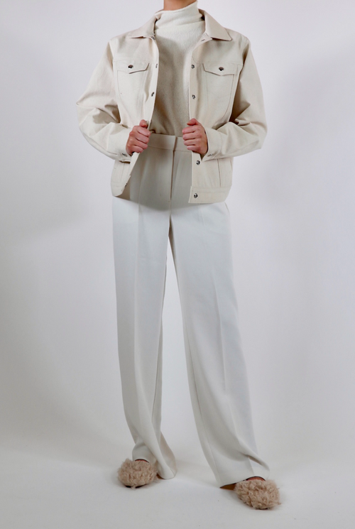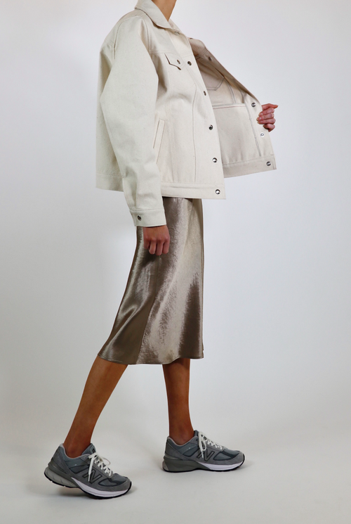 Oakland jean jacket is cut for an oversized fit creating a unique look and style. Luxurious, thick upcycled denim in a one of a kind off-white material. Made with 100% sustainable eco-cotton.