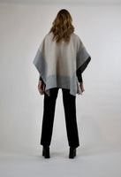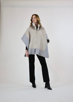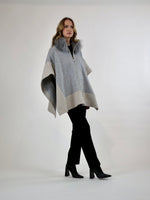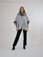 Cozy up in sustainable style with our Blanket Cape. Crafted from a plush recycled wool blend in heather grey or beige, it features an inverse color outline and luxurious recycled trim.  Heather grey wool with beige outer outline with recycled Mongolian lamb trim. Heather beige wool with grey outer outline with recycled fox fur trim.