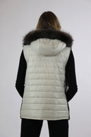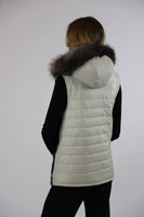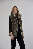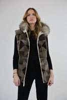 The ultimate layering piece that can be worn across seasons. A classic, and versatile vest that enhances your figure. Luxurious, thick upcycled Peruvian denim covered in a patch style brown sheared beaver fur. Recycled fox fur trim around the hood. Color and style of fur may vary slightly due to variations in the upcycling process.