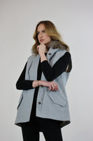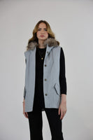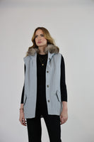The ultimate layering piece that can be worn across seasons. A classic, and versatile vest that enhances your figure. Luxurious, thick upcycled Peruvian denim in a one of a kind pale blue material. Color and style of fur may vary slightly due to variations in the upcycling process.