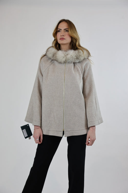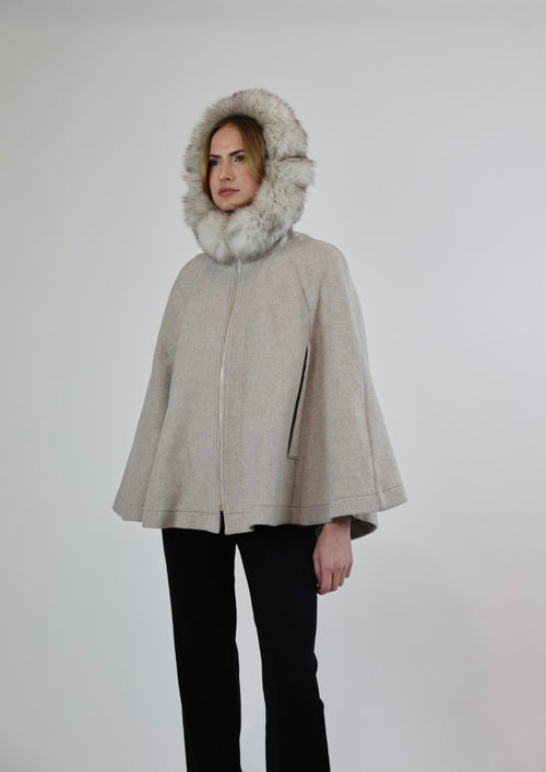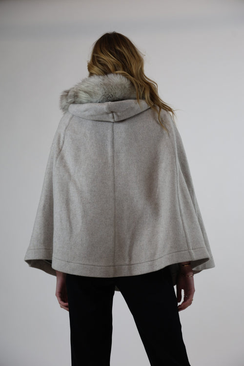 The cape offers a stylish and sustainable option, combining recycled materials like wool and fur with high-quality gold hardware accents. The heather beige colour provides a versatile and timeless look, while the recycled fox fur trim adds a touch of luxury and warmth around the hood area.