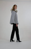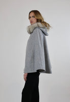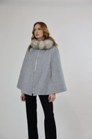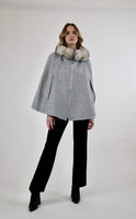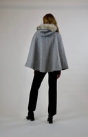 The cape offers a stylish and sustainable option, combining recycled materials like wool and fur with high-quality gold hardware accents. The heather grey color provides a versatile and timeless look, while the recycled fox fur trim adds a touch of luxury and warmth around the hood area. One Size.