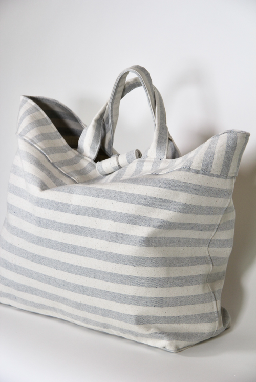 This tote bag is crafted from 100% sustainable eco-cotton, in a blue and off-white stripe upcycled denim material. Perfect for everyday use, to hold all of your essentials.